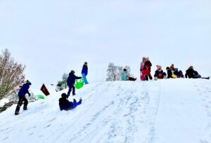 Wenn der Winter schon mal persönlich vorbeischaut, lassen wir ihn natürlich nicht vor der Turnhallentür stehen. Statt Turnschuhen kamen letzte Woche Schlitten, Poporutscher und jede Menge gute Laune zum Einsatz!