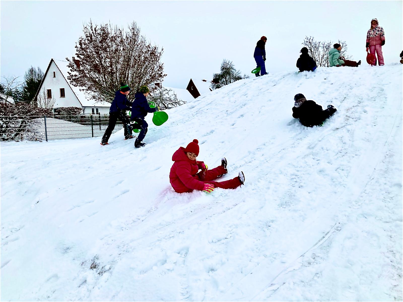 Wenn der Winter schon mal persönlich vorbeischaut, lassen wir ihn natürlich nicht vor der Turnhallentür stehen. Statt Turnschuhen kamen letzte Woche Schlitten, Poporutscher und jede Menge gute Laune zum Einsatz!